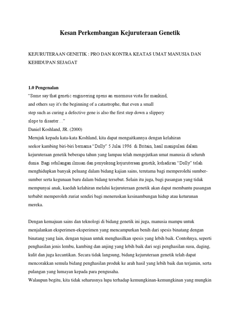 Salah satu isu yang paling kontroversi dalam bidang perubatan selama bertahun tahun masih diklon. Kejuruteraan genetik adalah istilah yang digunakan kepada pengubahsuaian genetik sesuatu organisma kejuteraan genetik juga dikenali sebagai teknologi dna rekombinan kerana gen yang terdiri daripada urutan dna tertentu diasingkan dan digabung semula dengan dna organisma lain. Untuk dan terhadap prosedur ini banyak. Selepas kejuruteraan genetik jelas nanoteknologi merupakan satu lagi bidang yang akan berkembang pesat di abad ini.