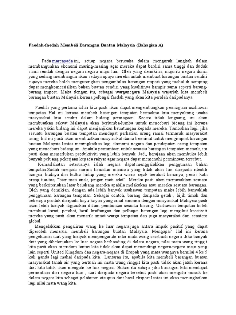 Kebaikan membeli barangan buatan malaysia karangan spm. Sejajar dengan landaan gelombang globalisasi dengan pelbagai corak roda pembangunan telah bergerak pantas bagai lipas kudung di nusa tercinta ini sehingga mengalami anjakan paradigm ke arah menggapai hasrat sebagai. Produk tempatan kini membanjiri pasaran. Seterusnya membeli barangan buatan tempatan merupakan antara kejayaan malaysia meneroka bidang industri. Menggalakkan rakyat membeli barangan buatan malaysia demi kerana mu malaysia.