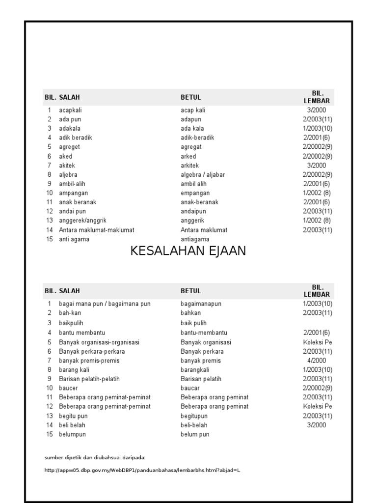 Senarai Kesalahan Ejaan Dan Imbuhan Bahasa Melayu