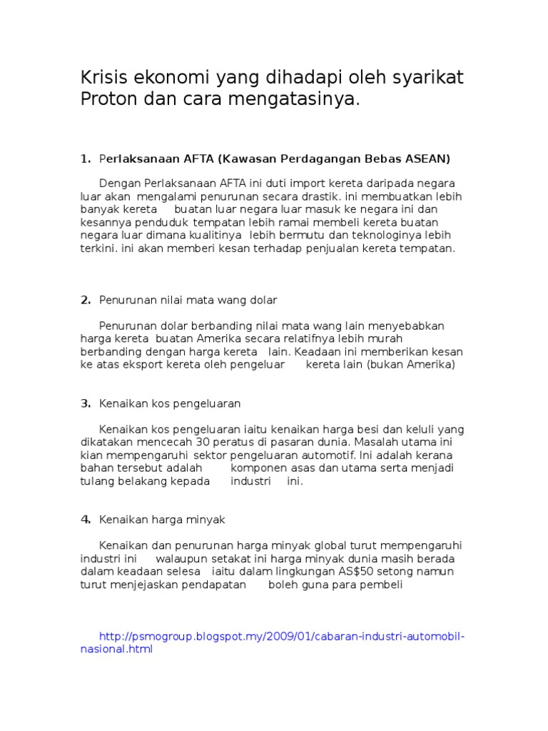 Krisis Ekonomi Yang Dihadapi Oleh Syarikat Proton