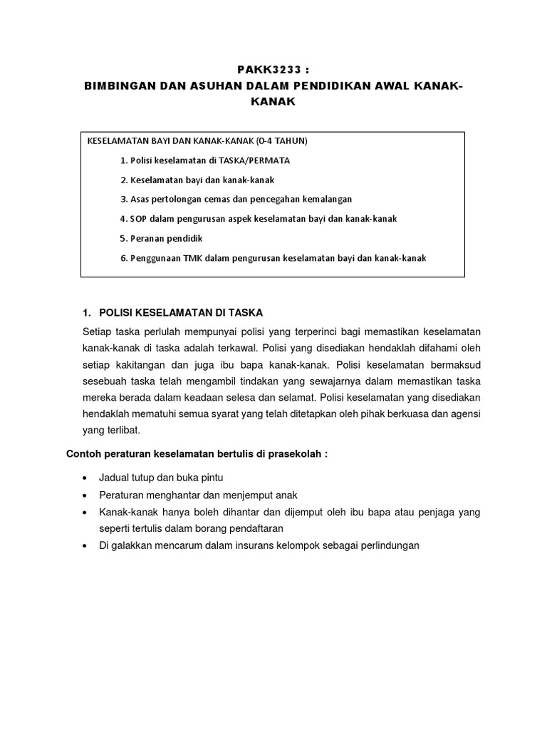 Keselamatan di taska di pra sekolah pengenalan definisi keselamatan konsep keselamatan merujuk kepada langkahlangkah yang dilaksanakan oleh individu atau kumpulan untuk mengelakkan kemudaratan seperti kemalangan kematian atau kecederaan tanpa perlindungan keselamatan individu akan berasa takut bimbang atau mudah terdedah kepada sesuatu yang memudaratkannya sama ada secara sedar. Menteri perpaduan negara datuk halimah mohamed sadique berkata pihaknya melalui jpnin di setiap daerah negeri ini akan menyemak semula aspek keselamatan taska dan tadika yang ada di sarawak.