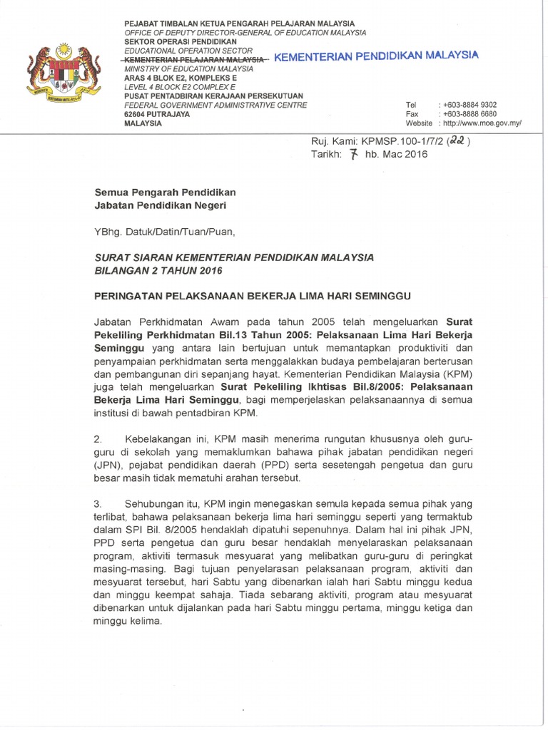 Telo Pejipo 3peg4 Surat Siaran Kementerian Pendidikan Malaysia Bilngan 2 Tahun 2016 Peringatan Perlaksanaan Bekerja Lima Hari Seminggu