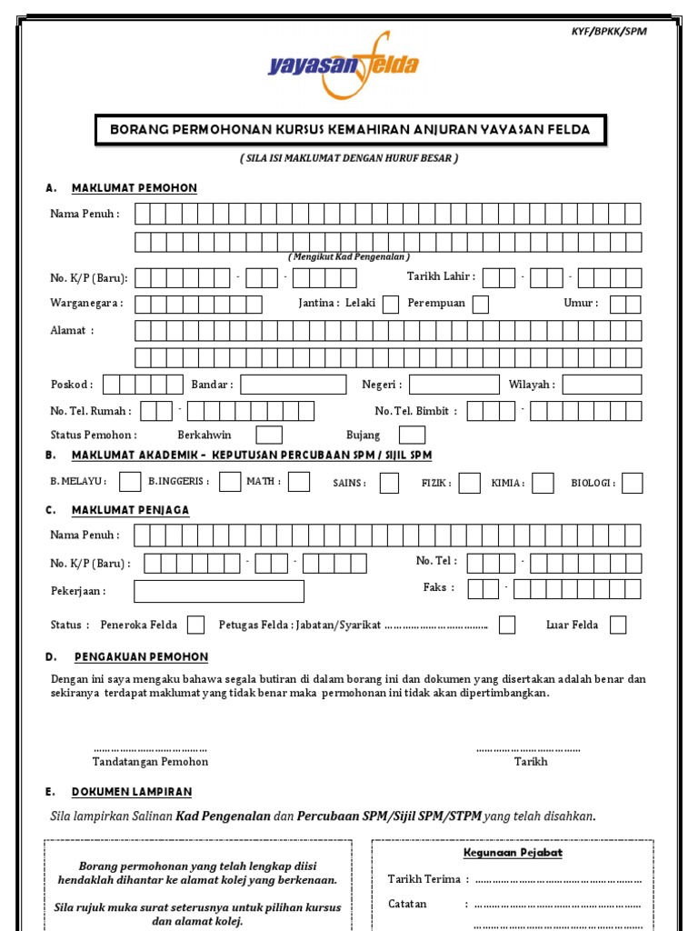 Bborang Permohonan Kursus Kemahiran Kolej Yayasan Felda 2013 New 23 8 13 Pdf Document