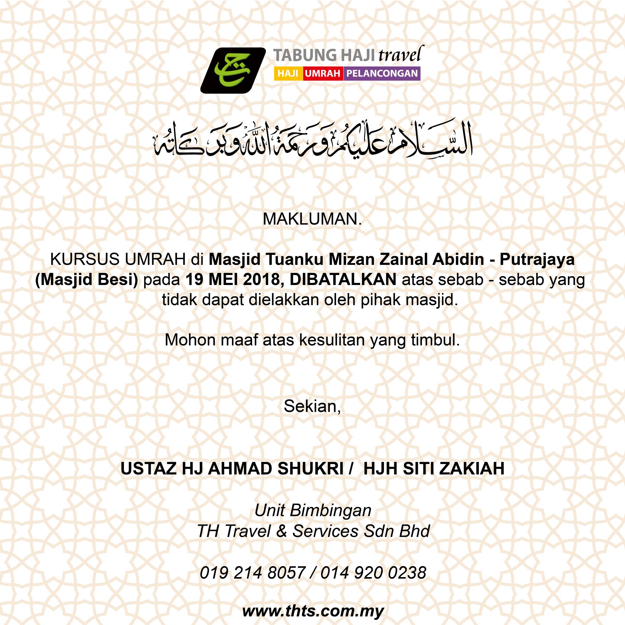 Tabung Haji Travel On Twitter Makluman Kursus Umrah Di Masjid Tuanku Mizan Zainal Abidin Masjid Besi Putrajaya Pada 19 Mei 2018 Dibatalkan Atas Sebab Sebab Yang Tidak Dapat Dielakkan Oleh Pihak Masjid Keterangan