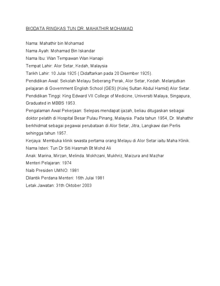 Dr Mahathir Latar Belakang Tun Dr Mahathir Bin Mohamad Yang Juga Digelar Sebagai Dr M Dan Nama Penanya Che Det Dilahirkan Pada 20 Disember 1925 Di Course Hero