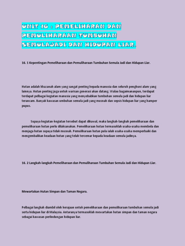 Unit 16 Pemeliharaan Dan Pemuliharaan Tumbuhan Semulajadi Dan Hidupan Liar