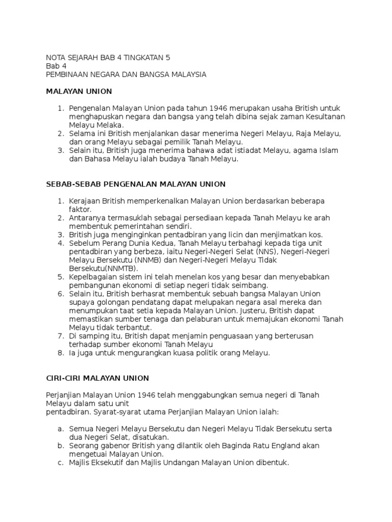 Sejarah Spm Nota Padat Sejarah Tingkatan 5 Bab 4 Pembinaan Negara Dan Bangsa Malaysia